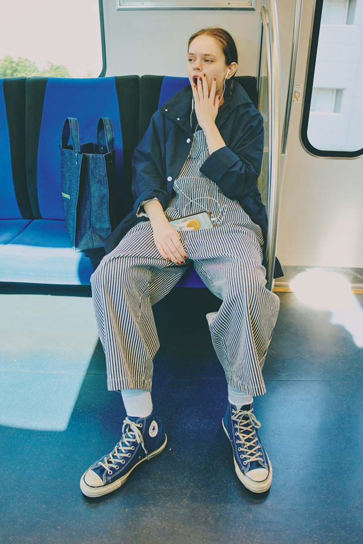 週の真ん中ってどうしたって気が緩む。そんな日は、思い切って自分を甘やかすのがマイルール。選んだのは、タフでラフなヒッコリーストライプのオーバーオール。コートを羽織って、全体をシックなブルーでまとめれば、カジュアルさの中にきちんと感が加わっていい感じ。