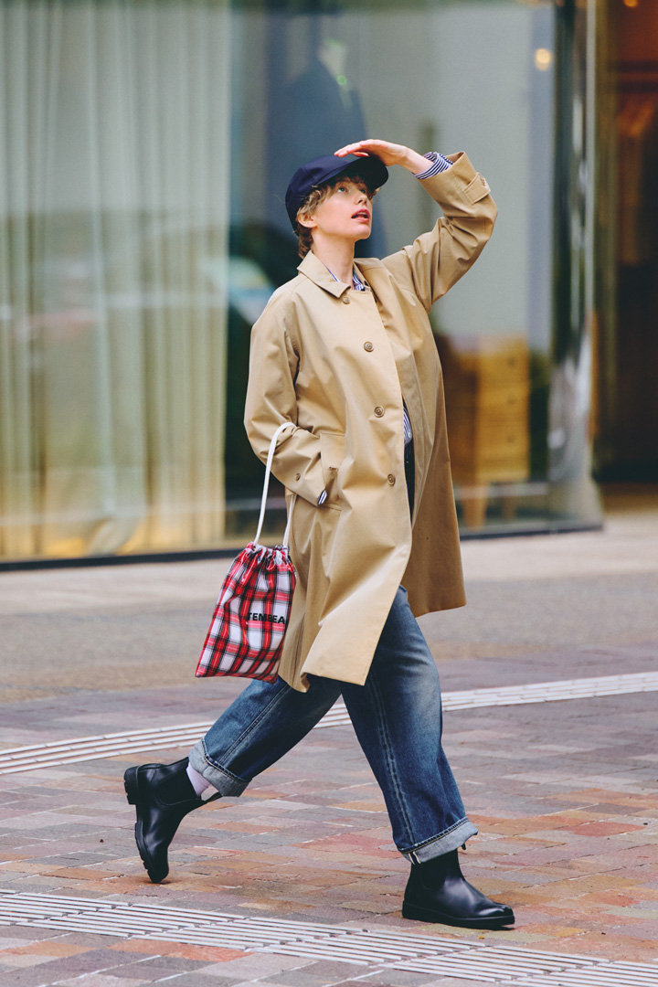 コート¥132000、キャップ¥12100/ともにnanamica(ナナミカ D.W.S.)、バッグ¥8800/ TEMBEA(テンベア トウキョウ)、ブーツ¥31900/ Blundstone(シードコーポレーション)、シャツ¥26400/TICCA 、デニムパンツ¥53900/chimala(ともにジャーナル スタンダード ラックス 表参道店)、ソックス/スタイリスト私物