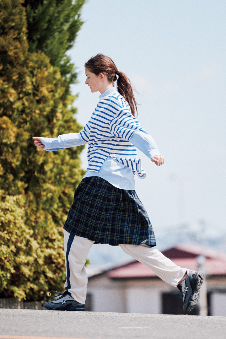 シャツ¥ 39600 / INDIVIDUALIZED SHIRTS(メイデン・カンパニー)、T シャツ¥7480 / BEAMS BOY ( ビームス ボーイ 原宿)、スカート¥16500 / CRANK( ハナ コリア)、パンツ¥7150、スニーカー¥19800 /ともにNew Balance( ニューバランスジャパンお客様相談室)