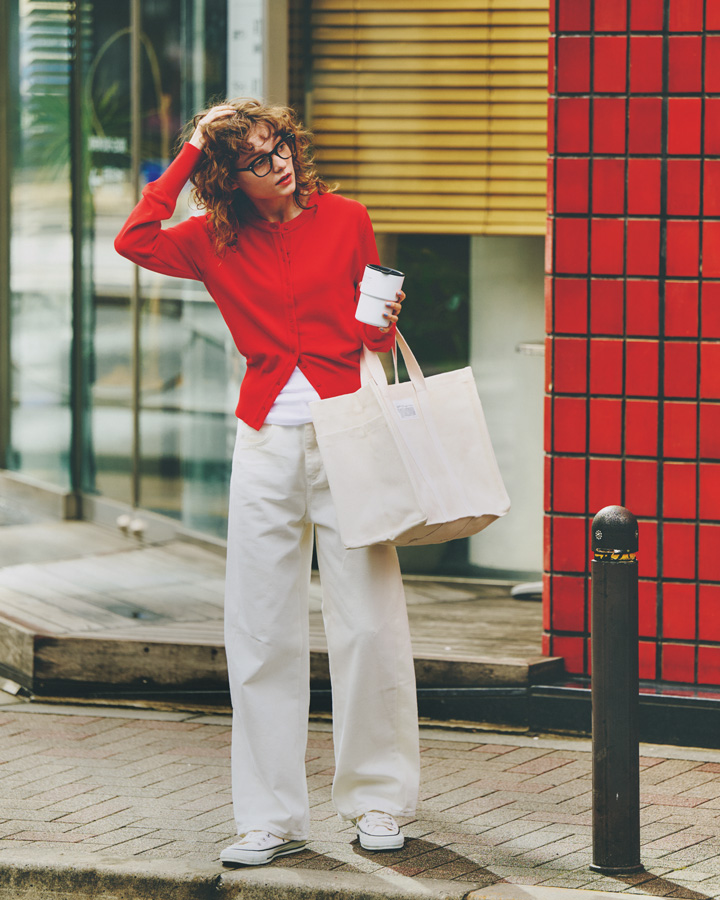 カーディガン¥18700、デニムパンツ¥18260、バッグ¥9790、タンブラー¥5170 /以上すべてGBH(ジービーエイチ)、タンクトップ¥3080 / Hanes(ヘインズブランズ ジャパン カスタマーセンター)、その他/スタイリスト私物