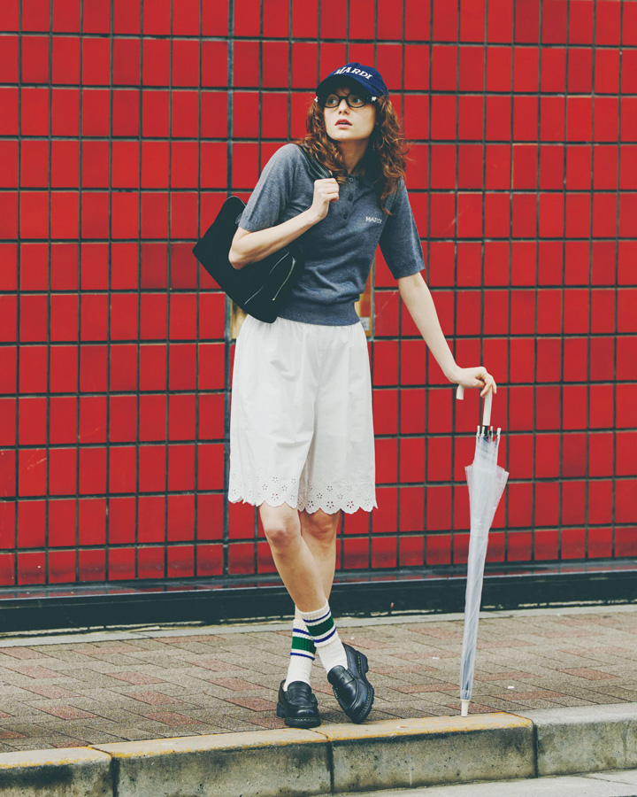 ポロシャツ¥15950、ショートパンツ¥20900、キャップ¥6600、メガネ¥34100/以上すべてMardi Mercredi(マルディメクルディジャパン)、バッグ¥37500/TOUT Y EST(トゥティエ)、ソックス¥2970/THE RAILROAD SOCK(メイデン・カンパニー)、シューズ¥94600/Paraboot(パラブーツ青山店)