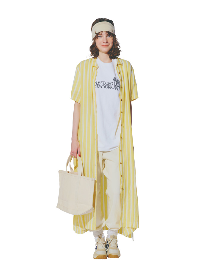 ワンピース¥25300/Barbour(バブアー パートナーズ ジャパン)、Tシャツ¥6600/5BORO(モットハウス・トーキョー)、スウェットパンツ¥22000/Véritécoeur(ヴェリテクール)、ヘアバンド¥6600/La Maison de Lyllis(メゾンドリリス)、バッグ¥11000/L.L.Bean(エル・エル・ビーン カスタマーサービスセンター)、ソックス¥4290/HOiSUM(ホイサム)、スニーカー¥14300/KEEN(キーン・ジャパン)