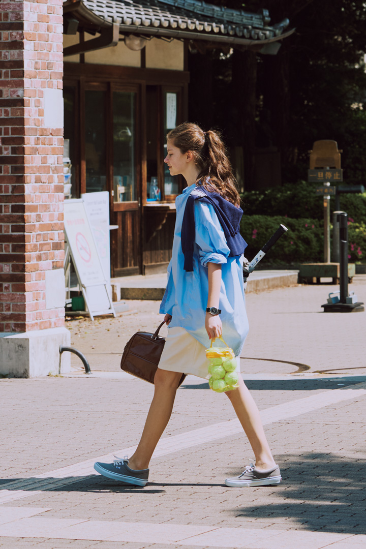 シャツ¥24200 / Véritécoeur(ヴェリテクール)、カーディガン¥19800 / LA MARINE FRANÇAISE(マリン フランセーズ代官山店)、ショートパンツ¥29700 / NEAT(にしのや)、スニーカー¥5390/VANS(エービーシー・マート)、バッグ(左)¥38500/ CHRISTIAN VILLA(ジャーナル スタンダード ラックス 表参道店)、バッグ(右)¥14300 /BATTLE LAKE OUTDOORS(メイデン・カンパニー)、時計¥17600 / NAVAL WATCH(ザボウ 渋谷店)