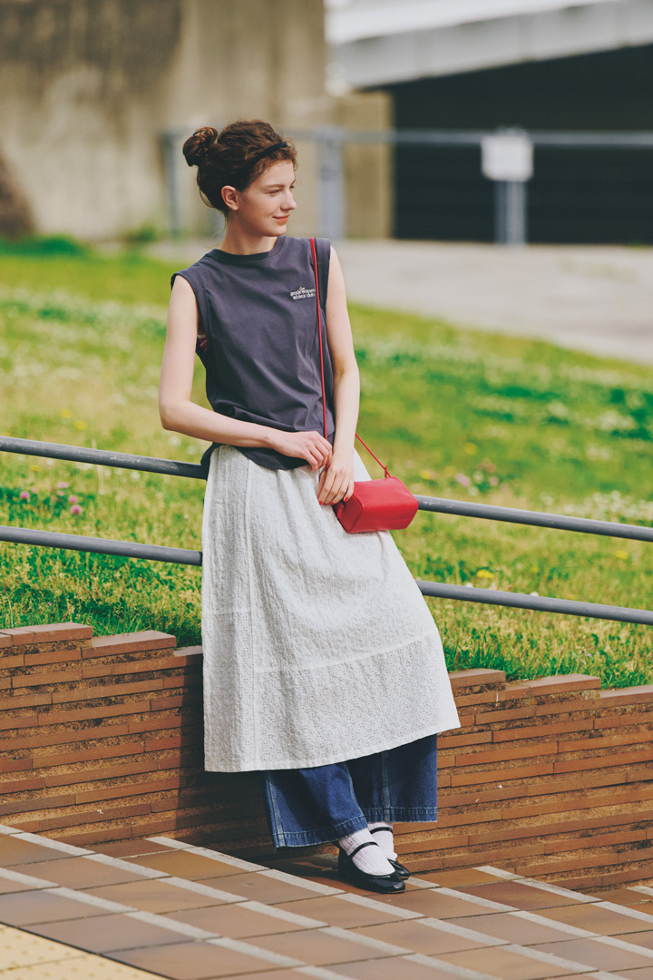 タンクトップ¥10450/Americana for SALON(ジュンカスタマーセンター)、中に着たタンクトップ¥2990/Gap(ギャップ)、スカート¥35200/nest Robe(ネストローブ 表参道店)、デニムパンツ¥17930/BIGMAC for BEAUTY&YOUTH(ユナイテッドアローズ 渋谷スクランブルスクエア店)、カチューシャ¥19800/ALEXANDRE DEPARIS(アレクサンドル ドゥ パリ GINZA SIX店)、バッグ¥50600/IL BISONTE(ルック D.C事業部)、ソックス¥4290/HOiSUM(ホイサム)、シューズ¥57200/Repetto(ルック ブティック事業部)