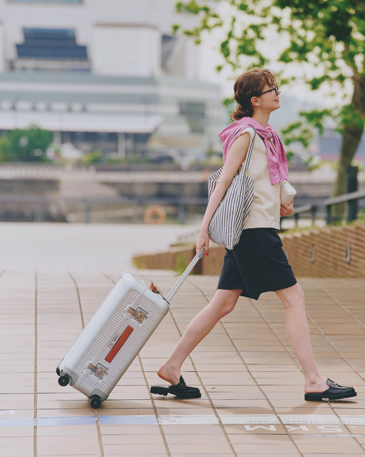 イタリア・ミラノ発、高級ラゲッジブランド《エフピーエム ミラノ》の代表作である「バンク」。厚さ0.01mmのアルミニウムを用いた、総重量7.4kgというハードなつくりは、丈夫でいて見た目もクール! 蝶のような形の留め具「バタフライロック」と、レザーハンドルの装飾からはクラシカルさも漂います。スムーズに動くキャスターも移動が楽ちんでありがたい。