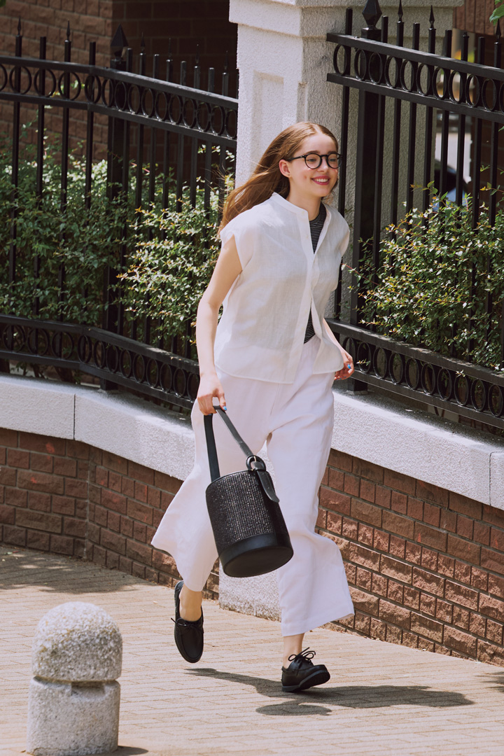 とても細い60番手の糸を高密度に打ち込むことで、天然の艶と光沢のある風合いに仕上げたフレンチシャツ。合わせるは、貴重なデッドストックのヴィンテージリネンで仕立てたパンツ。要所要所で黒を入れるとクリーンな白が際立ってより素敵に見える。