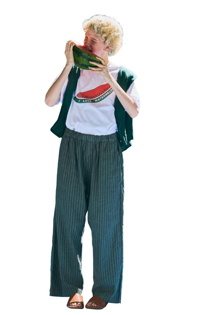 夏だもん。ファニーなTシャツで気分を上げて。リネン素材の涼やかパンツは、スイカみたいなシマシマで!足元はレザーのサンダルで引き締めましょう。