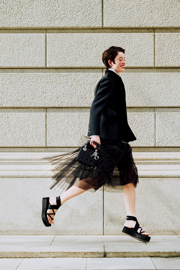 ジャケット¥1300000、シャツ¥350000[参考価格]、スカート¥870000、バッグ¥815000、サンダル¥150000/以上すべてDIOR(クリスチャン ディオール)