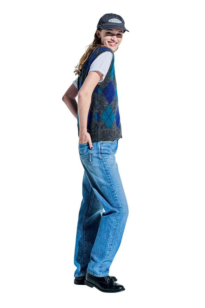 実は、シューズだけじゃないのよ!《 オニツカタイガー》のジーンズは、ジャパンデニムにこだわった快適な穿き心地。白Teeにアーガイル柄ベストのシンプルな組み合わせなら、ウォッシュ具合も相まって、ボーイッシュなムードが高まるね。