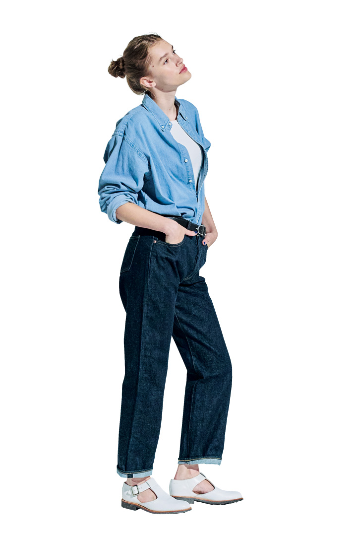 ハイウエストで股上も深い《ヤエカ》のジーンズ。裾までストンと落ちるストレートシルエットや、やや厚手のオーセンティックなデニム地は、裾をくるりとひと折りしても新鮮。濃色デニムパンツに淡色デニムシャツで色合いや質感で変化をつけるのもいいね。