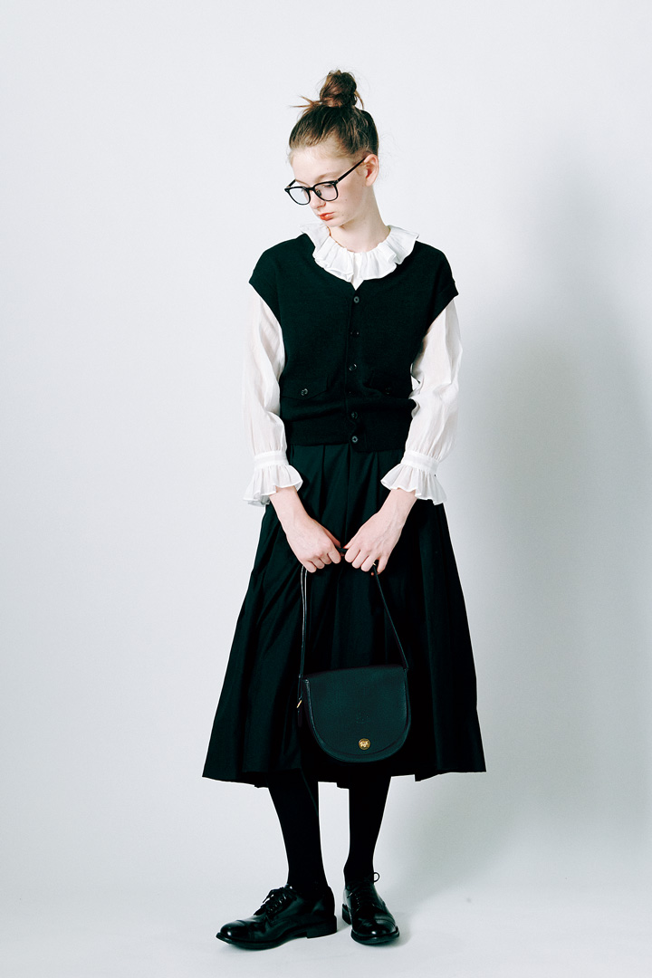 バッグ¥66000/IL BISONTE(ルック D.C事業部)、ブラウス¥28600/Bilitis dix-sept ans(ビリティス)、ベスト¥27500/LOEFF(エイチ ビューティ&ユース)、スカート¥17930/MidiUmi( マザーズインダストリー)、シューズ¥64900/SANDERS(サンダース ジャパン)、その他/スタイリスト私物