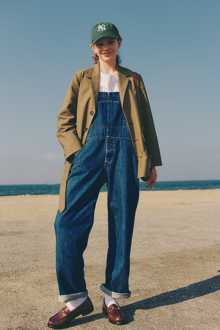 ジャケット¥30910/BEAMS BOY(ビームスボーイ 原宿)、オーバーオール¥41800、バッグ¥58300/ともにA.P.C(. アー・ペー・セー カスタマーサービス)、Tシャツ¥2189/United Athle(キャブ)、キャップ¥4400/‘47(フォーティーセブン)、ネックレス¥69300/MARIHA(マリハ)、ソックス[3P]¥3300/THE RAILROAD SOCK(メイデン・カンパニー)、シューズ¥35200/REGAL