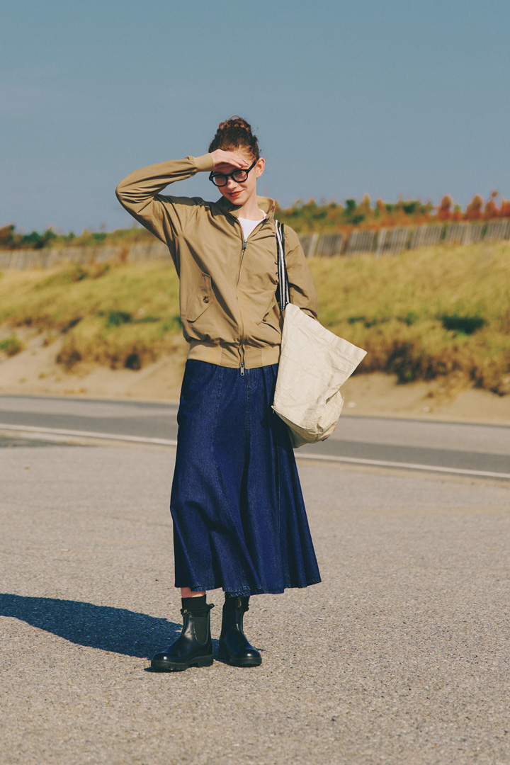 アイビーリーガーも愛したスウィングトップは、やっぱりクラシック。選ぶはもちろん元祖《バラクータ》の「G9 レギュラーフィット」。ジップを閉じてコンパクトに着て、ボリューミーなデニムスカートと合わせてAラインシルエットをつくろう。
