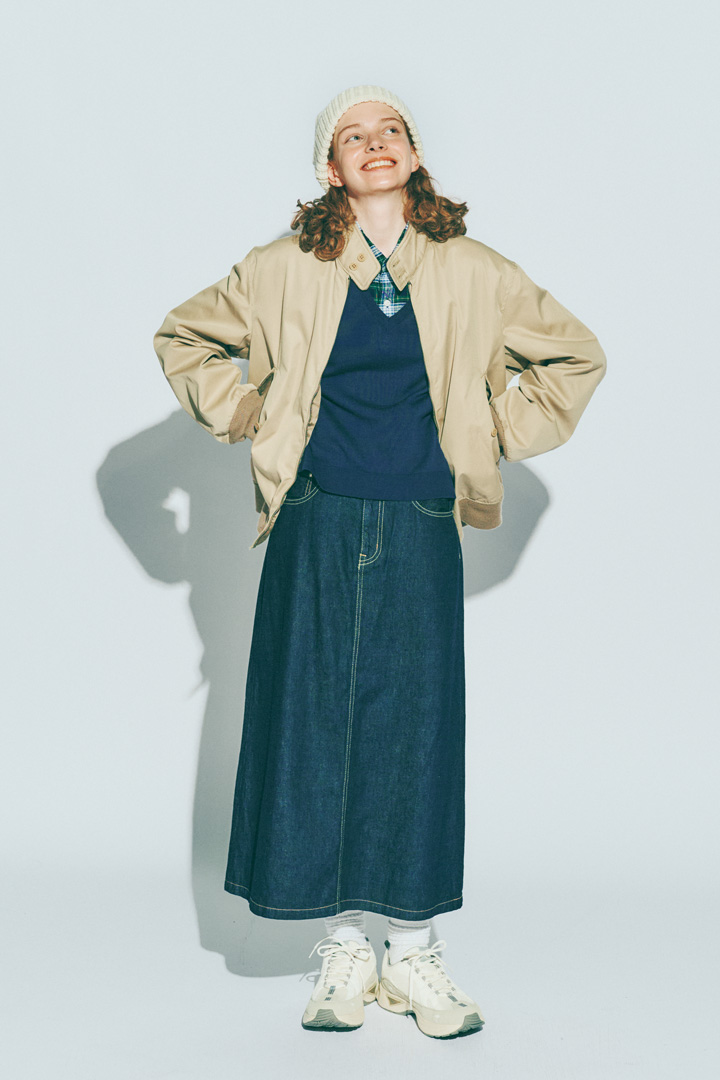 ジャケット¥69300/CIOTA(シオタ)、べスト¥13970/MidiUm(i マザーズインダストリー)、シャツ¥7700/Levi’s®️Blue Tab™(リーバイ・ストラウス ジャパン)、デニムスカート¥18700/çaqü(サキュウ ルームストア)、ニット帽¥6050/ HIGH LAND 2000 、ソックス[ 3P ]¥3300 / T H ERAILROAD SOCK(ともにメイデン・カンパニー)、スニーカー¥12100/HI-TEC(ムーンスター カスタマーセンター)