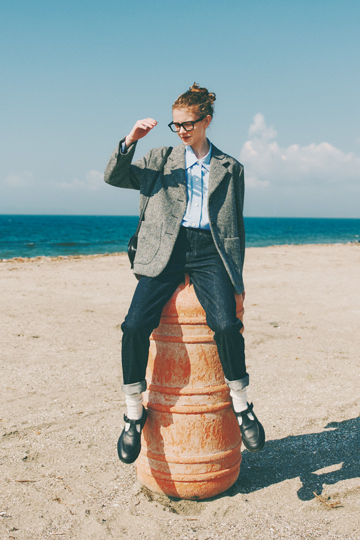 ジャケット¥107800、シャツ¥46200、バッグ¥154000、ソックス¥4180、シューズ¥88000/以上すべてMARGARET HOWELL、デニムパンツ¥40700/EDWIN FOR MARGARETHOWELL (以上すべてマーガレット・ハウエル)、メガネ¥54780/Oliver Peoples(ルックスオティカジャパン カスタマーサービス)