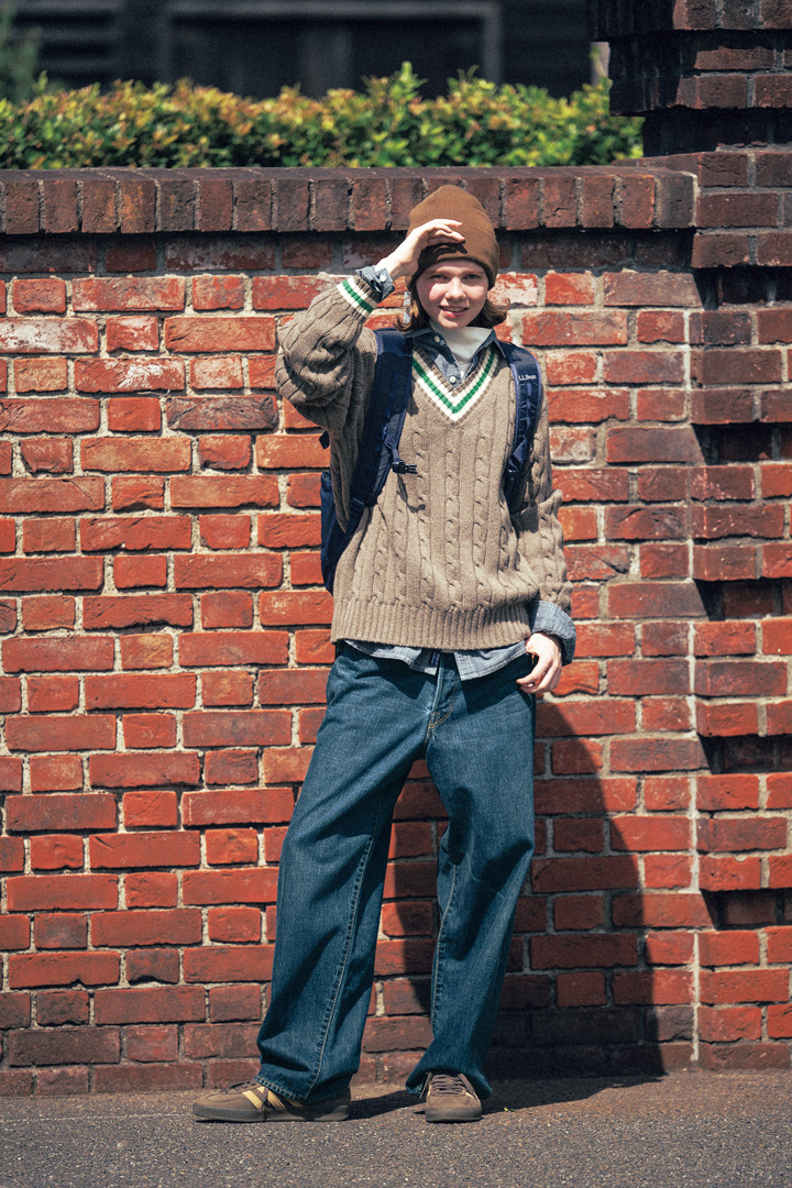 セーター¥39600、タートルネックカットソー¥11000/ともにSLOANE(ザ ショップスローン 新静岡セノバ店)、シャツ¥11000、バックパック¥17600/ともにL.L.Bean( エル・エル・ビーン カスタマーサービスセンター)、デニムパンツ¥36300/SCYE BASICS(マスターピースショールーム)、ニット帽¥3520/NewEra®︎(ニューエラ)、スニーカー¥16500/adidas(アディダス コールセンター)