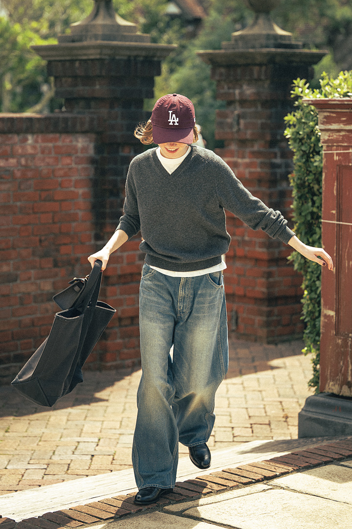 セーター¥38500/SLOANE(ザ ショップスローン 新静岡セノバ店)、Tシャツ¥1243/United Athle(キャブ)、デニムパンツ¥28600/THE SHINZONE(シンゾーンルミネ新宿店)、キャップ¥4620/New Era®︎(ニューエラ)、ハンドバッグ¥18700 /AULENTTI( セムインターナショナル)、トートバッグ¥16500/L.L.Bean (エル・エル・ビーン カスタマーサービスセンター)、シューズ¥81400/JOSEPH CHEANEY(ブリティッシュメイド 青山本店)