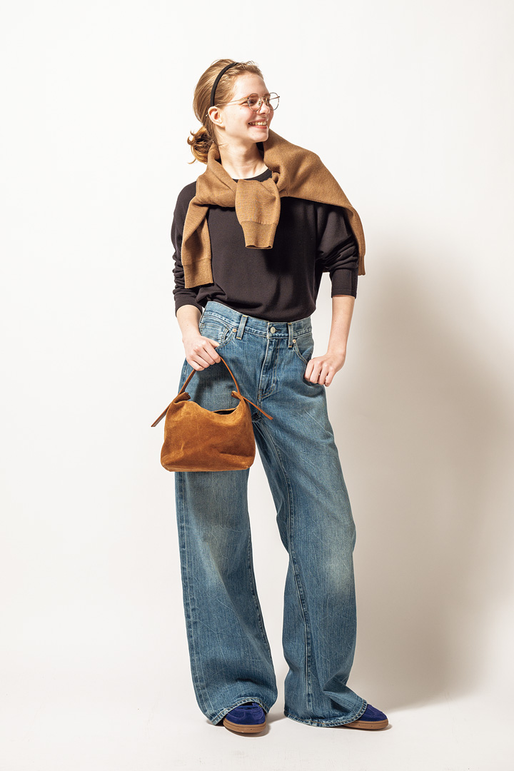 セーター¥36300/YLÈVE(イレーヴ)、肩にかけたセーター¥37400/SLOANE(ザ ショップ スローン 新静岡セノバ店)、デニムパンツ¥33000/Levi’s®︎(リーバイ・ストラウス ジャパン)、カチューシャ¥19800/ALEXANDREDE PARIS(アレクサンドル ドゥ パリGINZA SIX店)、メガネ¥62700/PETER AND MAY(コンティニュエ)、バッグ¥16500/AULENTTI( セムインターナショナル)、スニーカー¥15950/adidas(アディダス コールセンター)