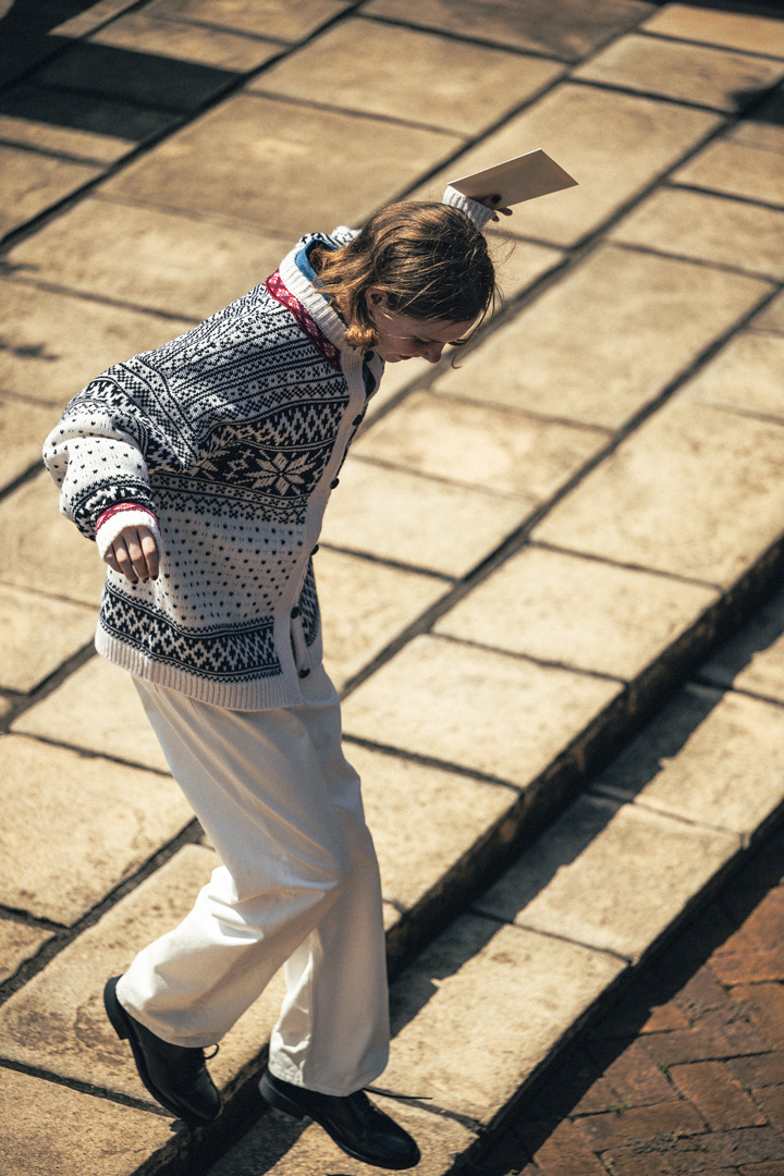 幾何学模様と大きな雪の結晶がキャッチーなノルディックセーター。合わせるのはもちろんホワイトのデニムパンツ。色が持つ清らかな雰囲気が装いを都会的に導いてくれるし、やっぱり雪と白って親和性があって相性バッチリなんだよね。