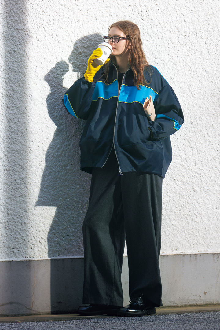 コンビニのホットコーヒーに癒される朝。最近ヘビロテしているステンカラーのブルゾンは、ゲーミングチェアをイメージした配色をサテン生地で表現。身体を包み込む立体的なフォルムだから、ミニマルなジャンプスーツに羽織るだけで、新鮮なシルエットが完成する。