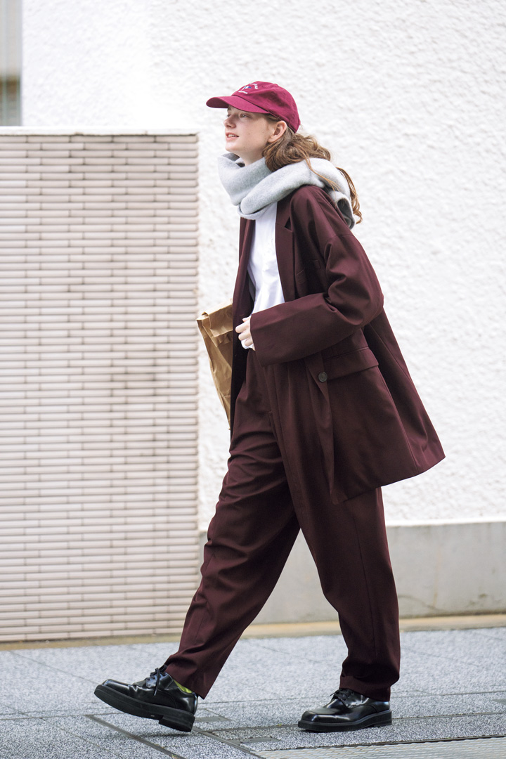大事な予定がある今日は、セットアップでちょっとかしこまってみる。着丈の長いドロップショルダーのジャケットと、コクーンシルエットのパンツ。ゆったり同士のコンビネーションだけど、レザーシューズと合わせたらスーツライクでいい感じ。約束が楽しみになってきた。