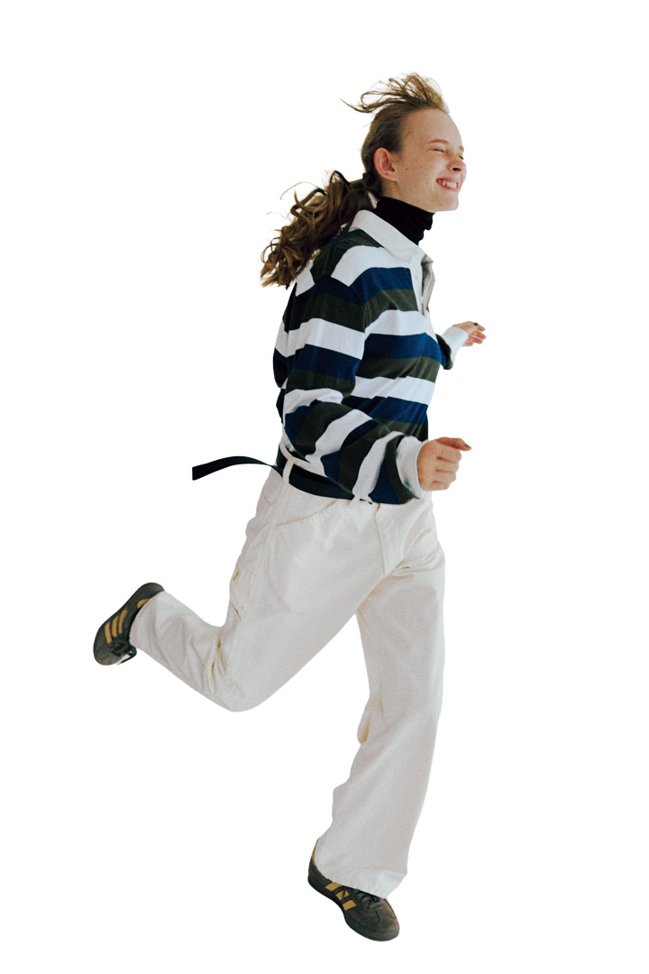 ラガーシャツ¥8800/Levi’s®(リーバイ・ストラウス ジャパン)、中に着たセーター¥51700/JOHN SMEDLEY(リーミルズ エージェンシー)、パンツ¥14300/Lee(エドウイン・カスタマーサービス)、ベルト¥18700/Scye(マスターピースショールーム)、シューズ¥16500/adidas(アディダスお客様窓口)