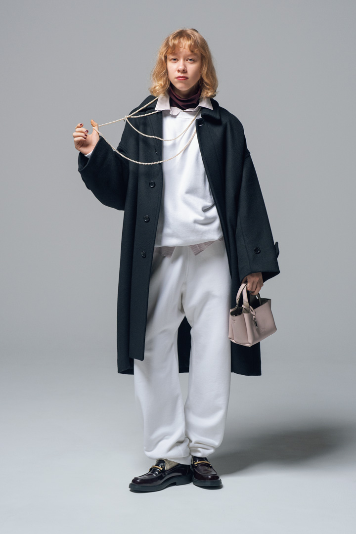 スウェットシャツ¥36300、スウェットパンツ¥39600/ともにHERILL(にしのや)、コート¥107800/Graphpaper( グラフペーパー 東京)、シャツ¥19800/journal standard luxe、タートルネックカットソー¥11000/YONETOMI NEW BASIC(ともにジャーナル スタンダード ラックス 表参道店)、ネックレス[90cm]¥44000、[120cm]¥57200/ともにCHERRY BROWN(チェリーブラウン)、バッグ¥174900、シューズ¥127600/ともにTOD’S(トッズ•ジャパン)、ソックス/スタイリスト私物