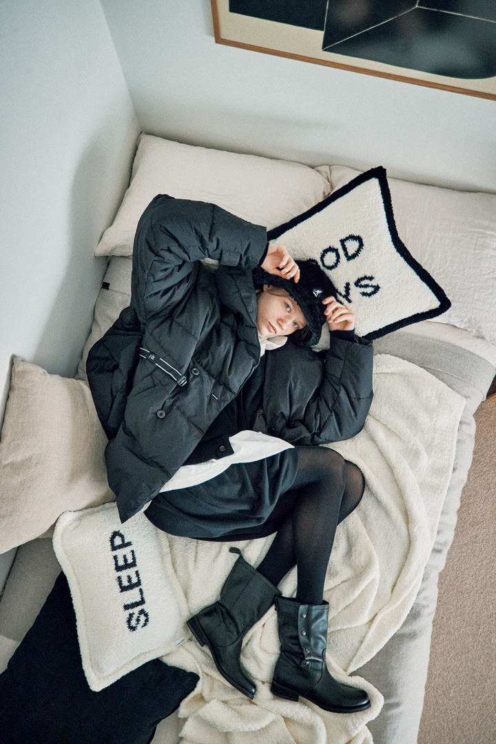 ダウンコート¥68200/F/CE.®(エフシーイーフラッグシップストアトウキョウ)、カーディガン¥91300/HERILL( にしのや)、シャツ¥ 21780 /MASTER&Co.( マッハ55リミテッド)、カットソー¥15400/UpcycleLino BASIC(ネストローブ 渋谷店)、ショートパンツ¥11880/MidiUmi( マザーズインダストリー)、ハット¥12100/KANGOL(カンゴール ヘッドウェア)、ブーツ¥62700/agnès b.( アニエスベー)、ブランケット¥30800、クッションカバー[GOOD DAYS]¥16500、ピローカバー[SLEEP]¥15400/以上すべてkashwére(カシウエア)、タイツ/スタイリスト私物