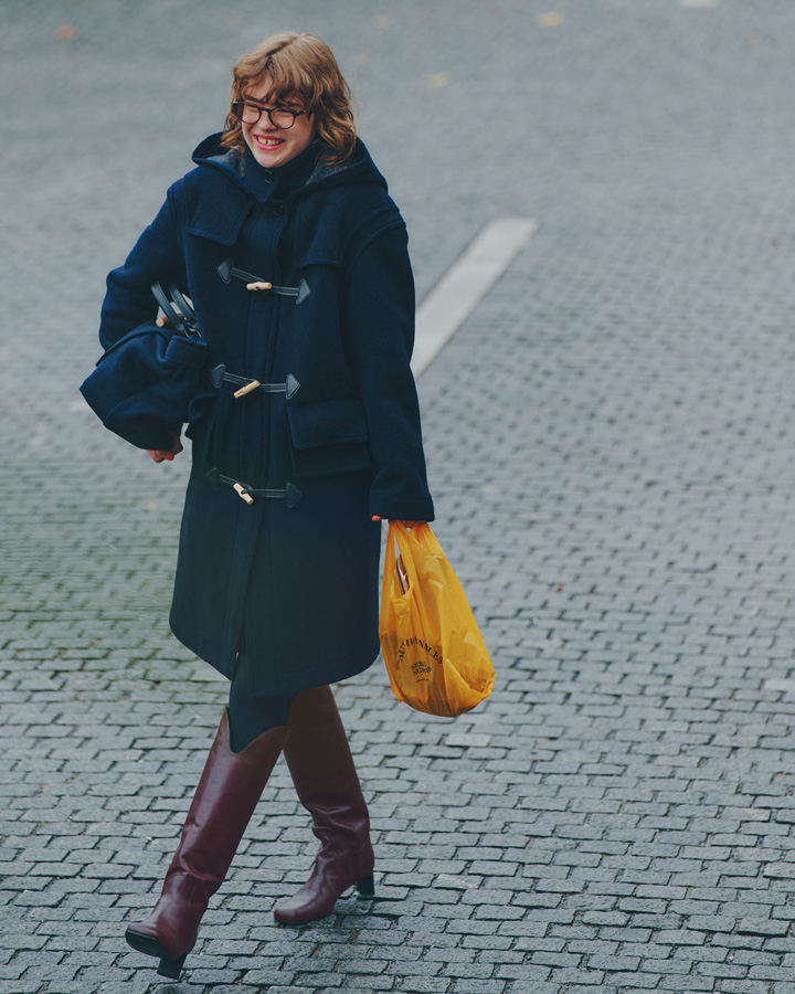 ダッフルコート¥192500、バッグ¥111100、ブーツ¥139700/以上すべてLONGCHAMP(ロンシャン・ジャパン)、メガネ¥26400 /LONGCHAMP(マーション ジャパン)、その他/スタイリスト私物