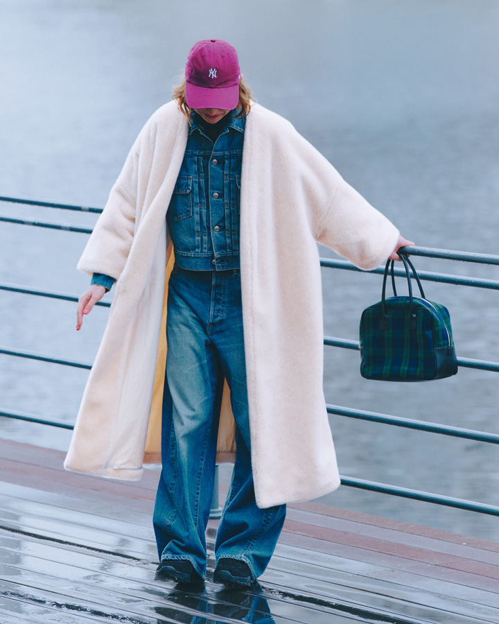 コート¥220000/TOUJOURS(トゥジュー 代官山ストア)、デニムジャケット¥49500、デニムパンツ¥57200/ともにHYKE(ボウルズ)、カットソー¥17600/YLÈVE(イレーヴ)、キャップ¥4400/’47(フォーティーセブン)、バッグ¥25300/KASSIOPEA(ジャーナル スタンダード ラックス 表参道店)、シューズ¥27500/pg(プレイグラウンド)