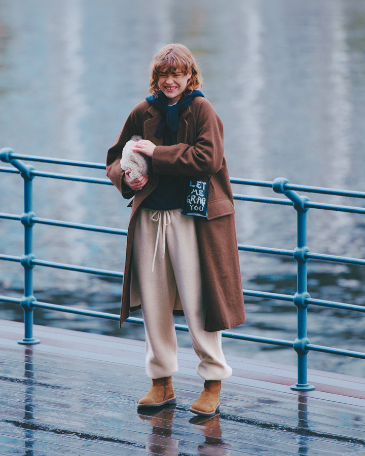 起毛加工を施した英国羊毛のコート。上質なカシミアをふんだんに使用したバラクラバとセーターとニットパンツ。ボア素材を用いたバッグとブーツ、ぜーんぶがお気に入り!身につけるアイテムの素材にとことんこだわったら、とびきり寒い冬の朝もへっちゃら。