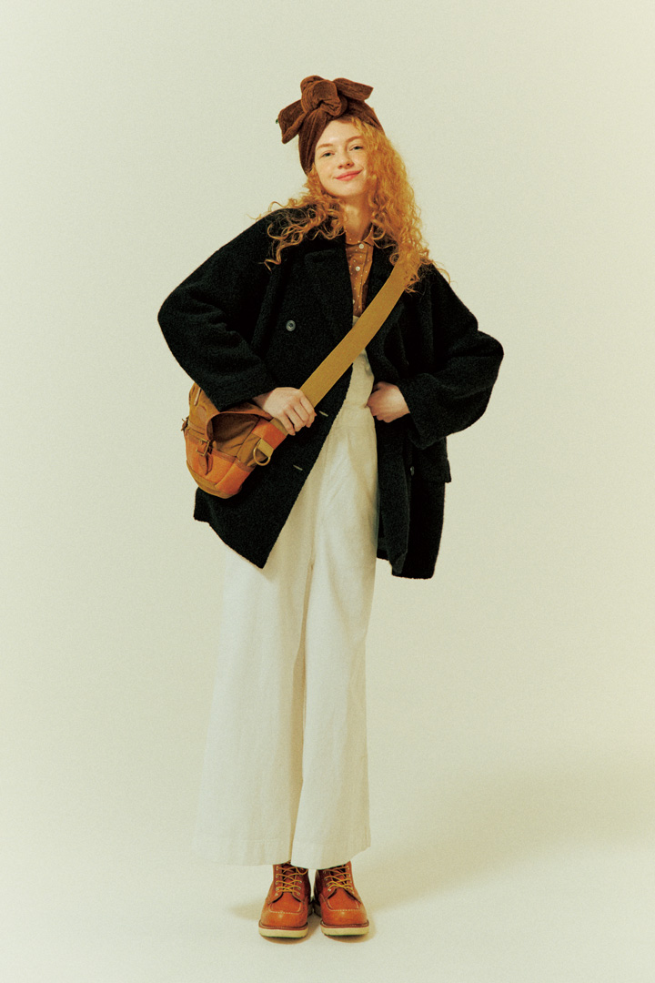 コート¥69300/maison de soil( メゾン ド ソイル恵比寿店)、ブラウス¥14960/MidiUmi( マザーズインダストリー)、オーバーオール¥27500/SHIPS NINE CASE(シップス インフォメーションセンター)、頭に巻いたマフラー¥11000/YDOT(ノルディスク アパレル)、バッグ¥48400/COTSWOLD AQUARIUS(メイデン・カンパニー)、ブーツ¥51150/RED WING(レッドウィング・ジャパン)