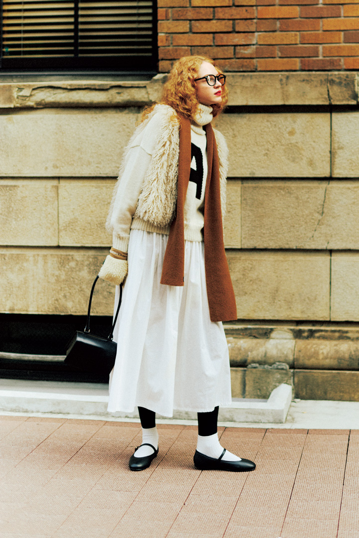 ベスト¥25300/HÉLIOPÔLE(エリオポール代官山)、セーター¥140800、スカート¥64900/ともにCABINET、マフラー¥20900/GREENTHOMAS(以上すべてマッハ55リミテッド)、メガネ¥22770/Ray-Ban(ルックスオティカジャパンカスタマーサービス)、手袋¥8800/IL BISONTE(ルック D.C事業部)、バッグ¥49500/BucketBaggage(アイネックス)、タイツ¥5500/MHL.(エムエイチエル.)、シューズ¥8690/Joli Encore(ABCマート)、ソックス/スタイリスト私物