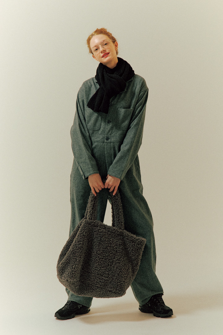 《マスター&コー》のジャンプスーツはフランネル製。あたたかく、やわらかく、滑らかで、まるでネコのような手触り。おまけにLike aCATなバッグを添えて印象的に導いて。