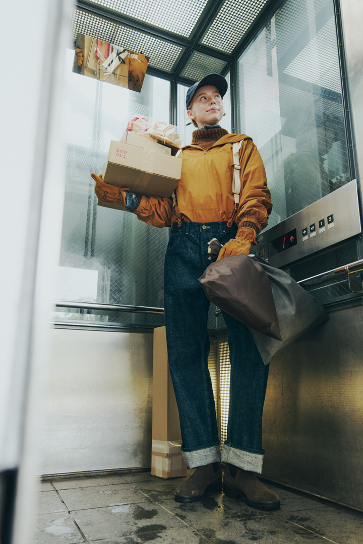 アノラック¥20900 / BEAMS BOY(ビームスボーイ 原宿)、タートルネックセーター¥37400/Shetland Woollen Co.( グラストンベリーショールーム)、デニムシャツ¥39600 / FILL THEBILL(フィル ザ ビル マーカンタイル)、デニムパンツ¥22000/Lee(エドウイン・カスタマーサービス)、キャップ¥9900/FULLCOUNT(フルカウント)、サスペンダー¥17380/MASTER&Co.(マッハ55リミテッド)、ブーツ¥29700 / Blu ndstone(シードコーポレーション)、手袋/スタイリスト私物