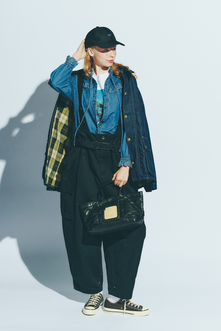 デニムジャケット¥69300、Tシャツ¥12100/ともにBarbour( バブアー パートナーズ ジャパン)、デニムシャツ¥13970/SOMETHING(エドウイン・カスタマーサービス)、オーバーオール¥25300/JOHNBULL(ジョンブル カスタマーセンター)、キャップ¥9900/SCYE BASICS、バッグ¥42900/Scye(ともにマスターピースショールーム)、ベルト¥13200/MHL.(エムエイチエル.)、スニーカー¥9900 / CONVERSE(コンバースインフォメーションセンター)、ソックス/スタイリスト私物