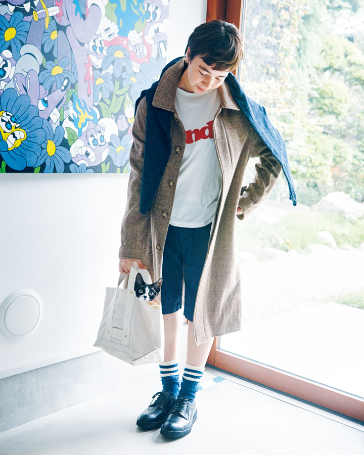 ニコさんが羽織っているコートは、《マスター& コー》の今季の新作。バルマカーンを元に比翼仕立てにアレンジされています。ウール79%、ナイロン16%、アルパカ5%の混率だから、ウールコートの堅く重ためな印象を払拭できて、軽くやわらかい雰囲気で着られます。さぁ、いよいよ家を出るという時、バッグの中にはムウムが。「一緒に行く? 」なんてね。