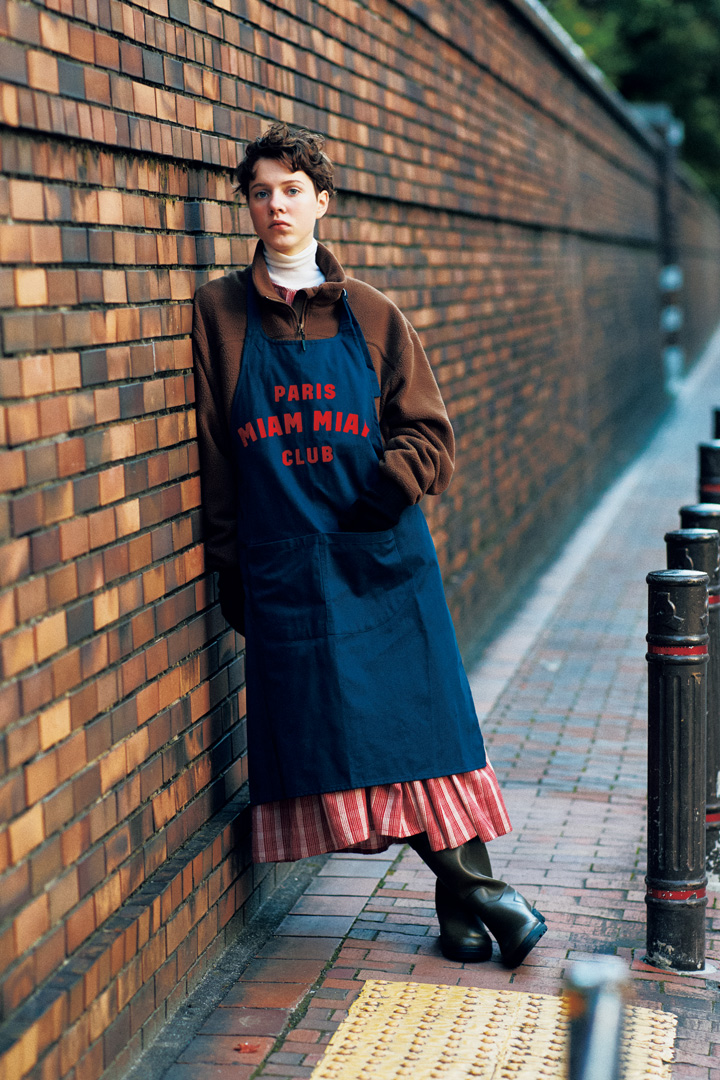 エプロン¥7150/Chez Alain Miam Miam(ファッジ)、ブルゾン¥22000/Marmo(t サードシップ)、ワンピース¥55000/maison de soil(メゾン ド ソイル恵比寿店)、タートルネックセーター¥52800/JOHN SMEDLEY(リーミルズ エージェンシー)、手袋¥7590/WILLIAMBRUNTON(セムインターナショナル)、レインブーツ¥33000/AIGLE(エーグルカスタマーサービス)