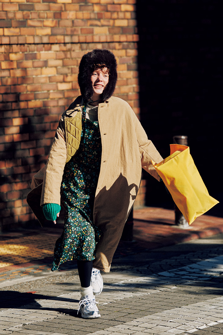 コート¥75900/Yarmo(グラストンベリーショールーム)、エプロン¥26400(エプロン商会)、セーター¥37400/BATONER(バトナー)、シャツ¥17600/ARMEN(ビューカリック&フロリック)、ハット[一部店舗限定]¥6990/Gap(ギャップ)、グローブ¥6930/FRATELLITALL(I セムインターナショナル)、バッグ¥2200/HIGHTIDE(ハイタイド)、タイツ¥1320、ソックス¥1100/ともに靴下屋(タビオ)、スニーカー¥19800/NewBalance(ニューバランスジャパンお客様相談室)