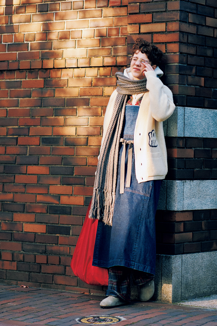 カーディガン¥30800/HOLLYWOOD RANCHMARKET(ハリウッド ランチ マーケット)、エプロン¥46200/Nigel Cabourn WOMAN(アウターリミッツ)、パジャマ[上下セット]¥13200/L.L.Bean(エル・エル・ビーン カスタマーサービスセンター)、フーディ¥40700/YAECA(ヤエカ アパートメント ストア)、メガネ¥56100/EYEVAN(アイヴァン 東京ギャラリー)、マフラー¥22000/BATONER(バトナー)、バッグ¥1320/nähe®(ハイタイド)、サンダル¥24200/BIRKENSTOCK(ヤエカ ホーム ストア)