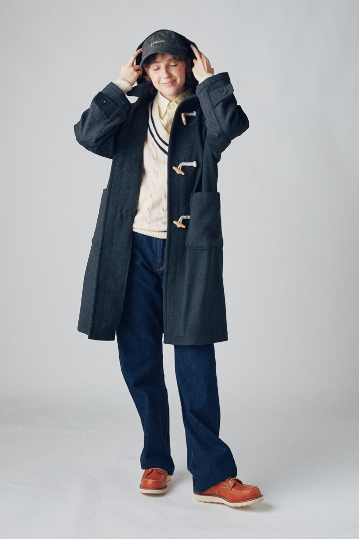 コート¥41580/MidiUmi( マザーズ インダストリー)、セーター¥39600/Alan Paine(真下商事)、シャツ¥16500、キャップ¥12980 /ともにJ.PRESSORIGINALS( J.プレス & サンズ 青山)、デニムパンツ¥29480 / FULLCOUNT(フルカウント)、ブーツ¥51150/RED WING(レッドウィング・ジャパン)