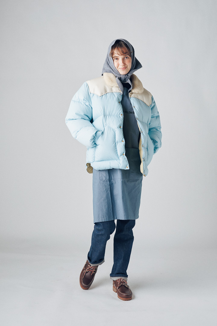ジャケット¥115500 / Rockey M ountain Featherbed(アール 柳橋)、エプロン¥4950/VOIRY(ヴォイリーストア)、デニムパンツ¥30800/ A.P.C.(アー・ペー・セー カスタマーサービス)、ストール¥12100 / WILLIAM BRUNTON(セムインターナショナル)、シューズ¥25300 / Tim berland(VF ジャパン)