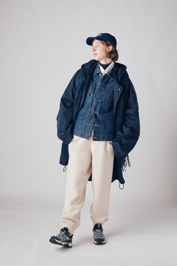 コート¥74800 / 77circa(77サーカ)、デニムジャケット¥42900/A.P.C.( アー・ペー・セー カスタマーサービス)、シャツ¥37400 / INDIVIDUALIZED SHIRTS、タートルネックセーター¥15400 / Souple Luz(ともにメイデン・カンパニー)、パンツ¥99000/BATONER(バトナー)、キャップ¥6600/HIGH ! STANDARD(ハイ! スタンダード)、マフラー¥13970/ TWEEDMILL(セムインターナショナル)、スニーカー¥18700/ Salomon(サロモン コールセンター)
