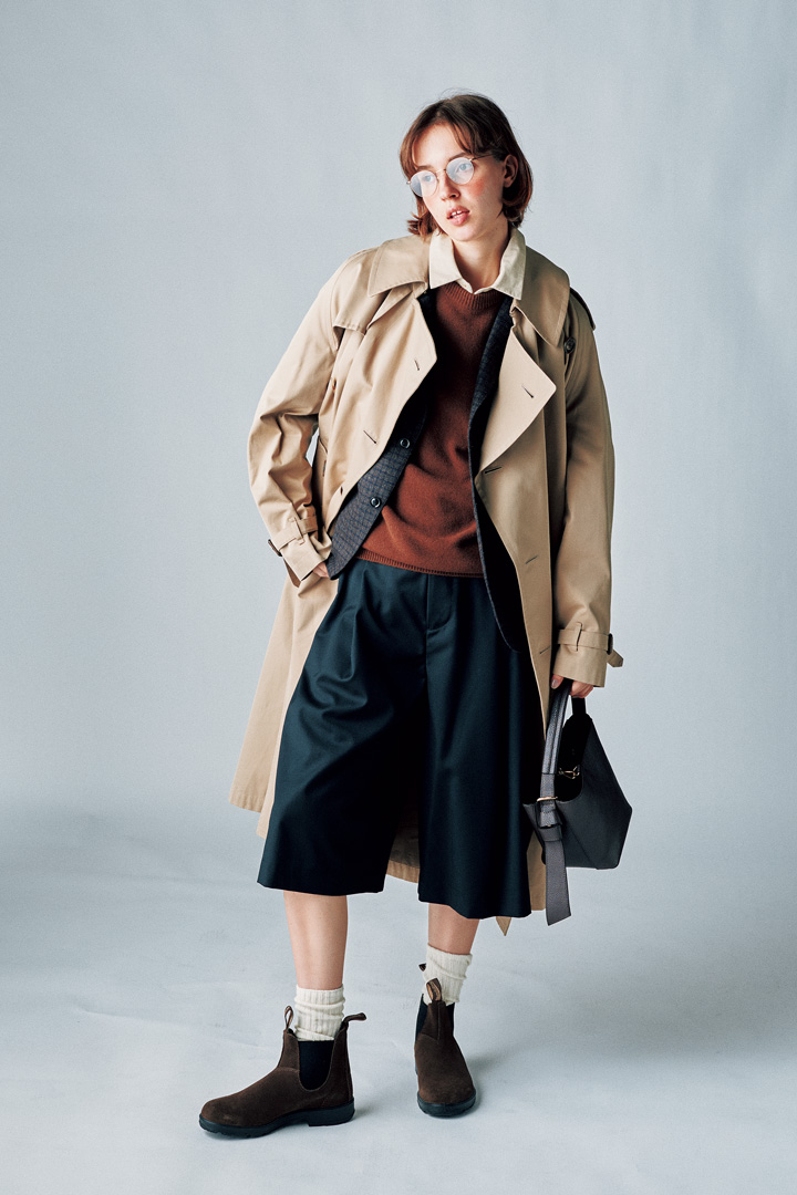 トレンチコート¥149600/CIOTA(シオタ)、ジャケット¥59800/BRITISH MADE(ブリティッシュメイド 青山本店)、セーター¥17600/NARUFACTORY(南出メリヤス)、シャツ¥27500/YAECA(ヤエカ アパートメント ストア)、パンツ¥20900/nicholson & nicholson(ナカガワ)、メガネ¥41800/EYEVAN(アイヴァン 東京ギャラリー)、バッグ¥19800/AULENTTI (セムインターナショナル)、ブーツ¥29700/Blundstone(シードコーポレーション)、ソックス/スタイリスト私物