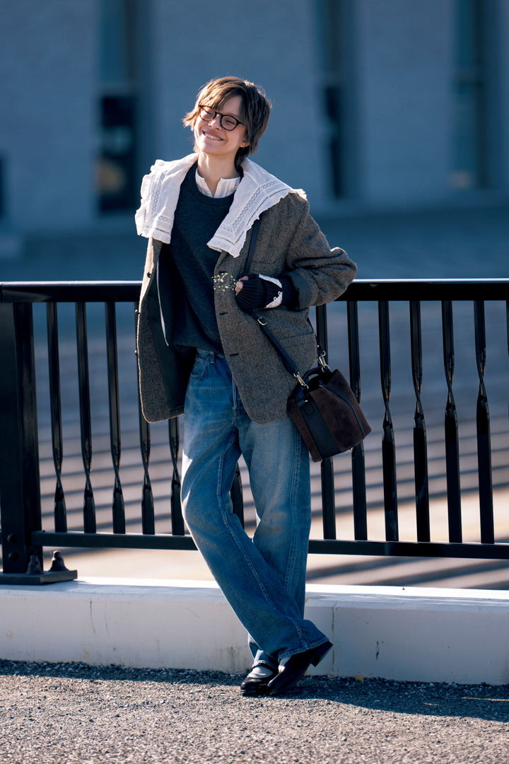 ジャケット¥87780、セーター¥29700/ともにorslow(ベースデニムプロダクツ)、ブラウス[レースカラー付き]¥44000/Nigel Cabourn WOMAN(アウターリミッツ)、デニムパンツ¥40880/FULLCOUNT(フルカウント)、メガネ¥38500/One Three CompoundFrame(デュアル)、バッグ¥22000/AULENTT(I セムインターナショナル)、グローブ¥3520/nenom(ジーンズファクトリー卸仲通店)、シューズ¥13750/HARUTA(ハルタ)、ソックス/スタイリスト私物