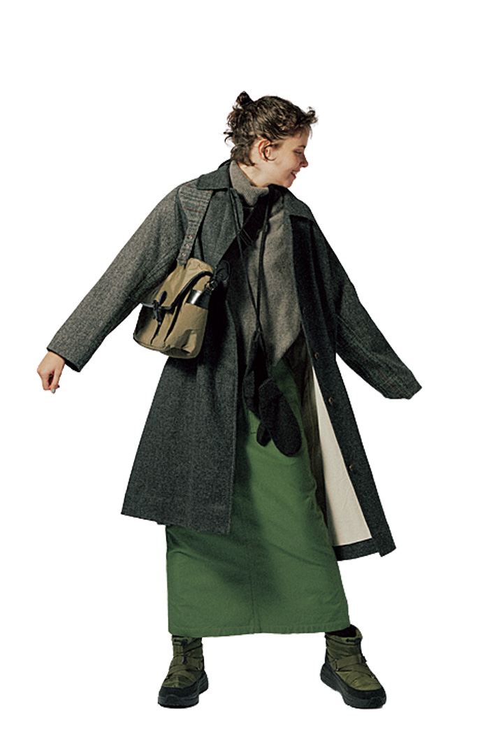 コート¥165000、スカート¥30800/ともにNigel Cabourn WOMAN(アウターリミッツ)、セーター¥14960/MidiUmi(マザーズインダストリー)、バッグ¥59400/GLENROYAL(ブリティッシュメイド 青山本店)、手袋¥7590/WILLIAM BRUNTON(セムインターナショナル)、ブーツ¥17600/TELIC(ドウシシャ)、タイツ/ スタイリスト私物