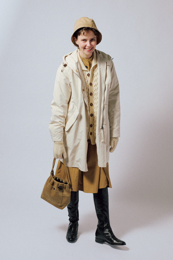 コート¥132000/SCYE BASICS(マスターピースショールーム)、カーディガン¥19800/OLDDERBY KNITWEAR(セムインターナショナル)、ワンピース¥31900、バッグ¥19800/ともにMHL.(エムエイチエル.)、ハット¥13200/nanamica(ナナミカ D.W.S.)、手袋¥6050/BLACK SHEEP(アソシエイテッド・インターナショナル)、ブーツ¥99000/KATIM(カチム)