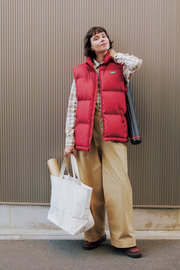 ベージュで繋げたスタイルに赤いダウンベストを重ねたら、’80sっぽい雰囲気に。シルエットにゆとりのあるアイテムを選んで、ノスタルジックなボーイスタイルを演出しよう。