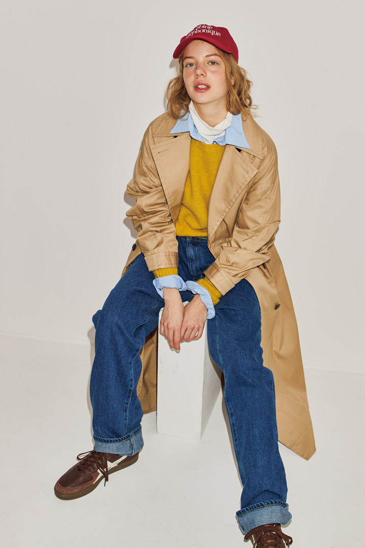 コート¥143000/J&M DAVIDSON(J&M デヴィッドソン カスタマーセンター)、セーター¥36300/Shetland WoollenCo.(グラストンベリーショールーム)、シャツ¥41800/INDIVIDUALIZED SHIRTS、ベルト¥17600/TORY LEATHER(ともにメイデン・カンパニー)、タートルネックカットソー¥3990/Gap(ギャップ)、デニムパンツ¥8690/EDWIN(エドウイン・カスタマーサービス)、キャップ[WEB SHOP限定]¥8250/THE SHINZONE(シンゾーンルミネ新宿店)、シューズ¥14300 /Onitsuka Tiger( オニツカタイガージャパン)