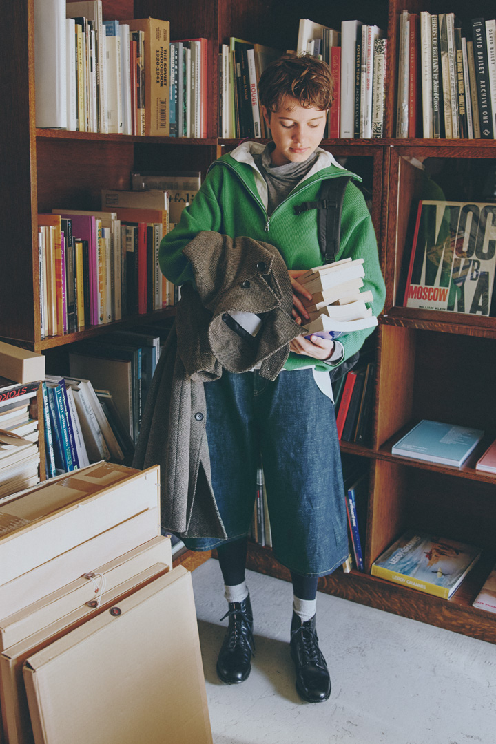 セーター¥25300/ANNUAL(MNインターファッション)、シャツ¥13200/N.O.R.C(ノーク)、ハイネックカットソー¥10890/MidiUmi( マザーズインダストリー)、ショートパンツ¥39600/HYKE(ボウルズ)、バックパック¥12100/OverLab(キャビアプロダクツ)、手に持ったコート¥38500/MARMARMAR(マーコート 自由が丘店)、ブーツ¥72600/SANDERS(サンダース ジャパン)、その他/スタイリスト私物